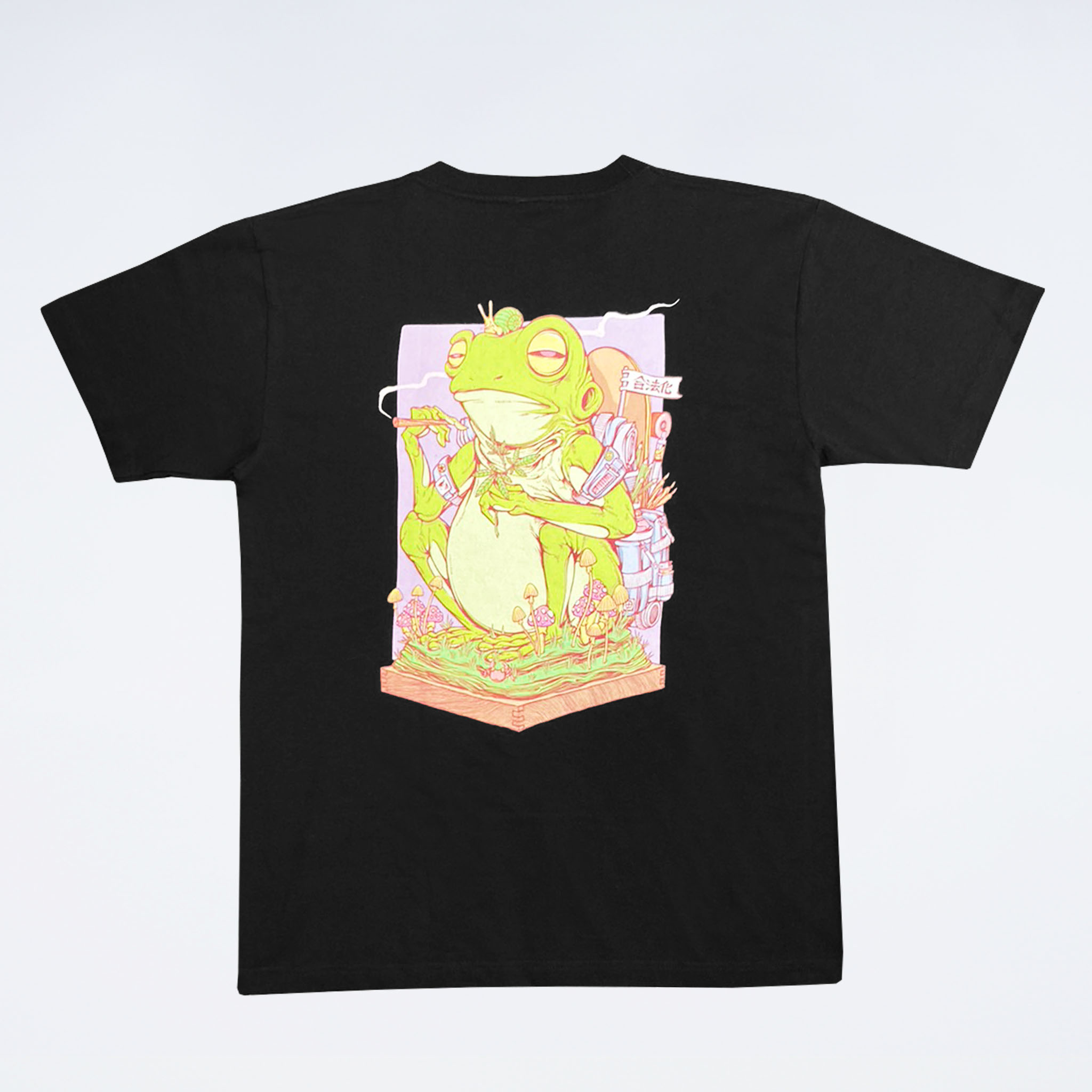 グラフィティアーティスト・SH11NAがデザインしたCHILLAXYらしいカエルのグラフィックを背面にプリント。胸元にはチラクシーのロゴを刺繍。