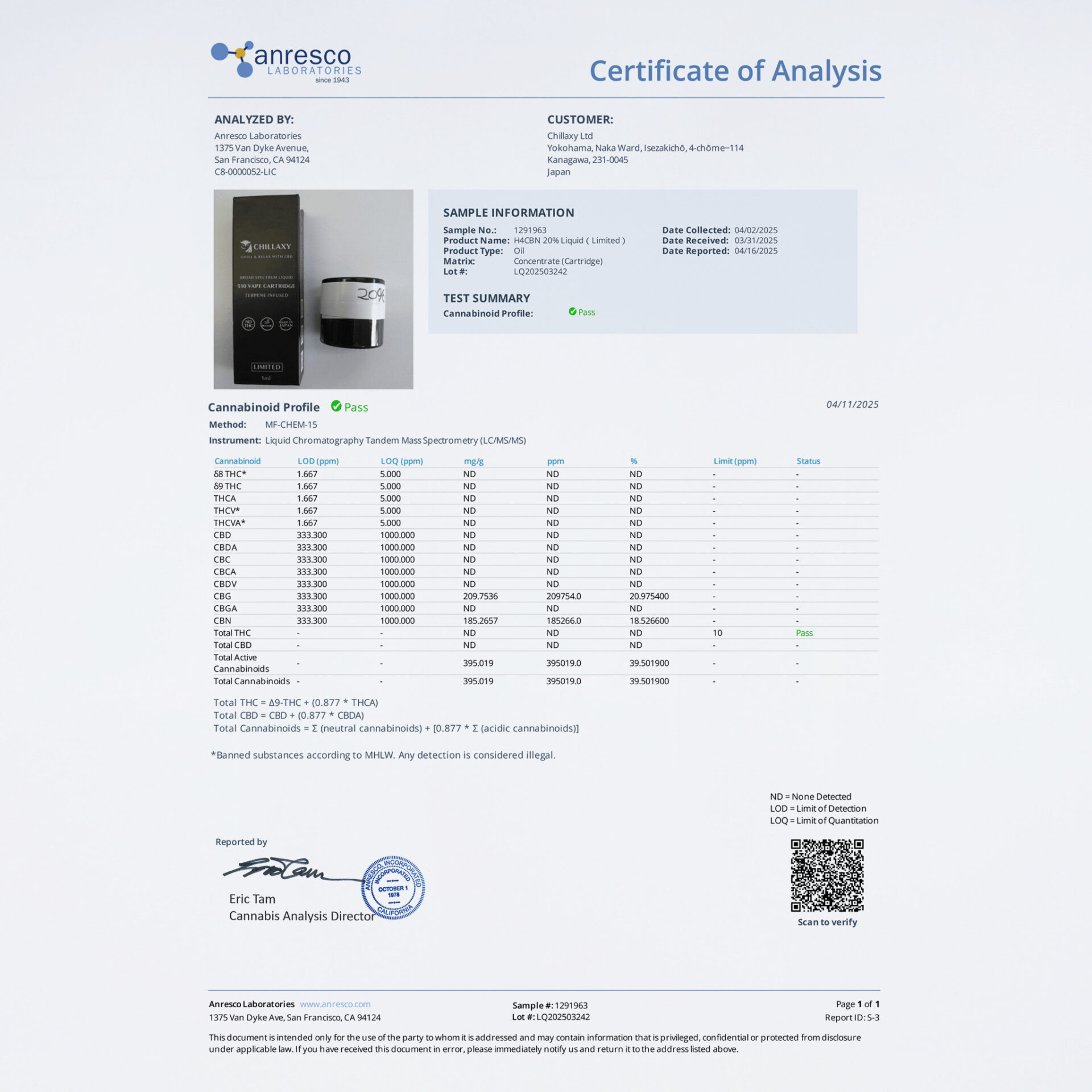 本品は数量限定で配合されたフルカンナビノイドリキッドです。リキッドは、複数のカンナビノイドとその他、植物由来テルペンを使用したチラクシーのハイエンドブレンドです。オリジナル配合による本物の香りをお楽しみいただけます。本品を使用するには、別売りの510規格のベイプバッテリーが必要です。