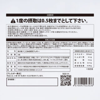 ・原材料:小麦粉(国内製造)、砂糖、バター、ホワイトチョコチップ(乳成分・大豆由来含む)、卵、抹茶入り粉末(乳成分含む)、CBN、塩、ベーキングパウダー、香料